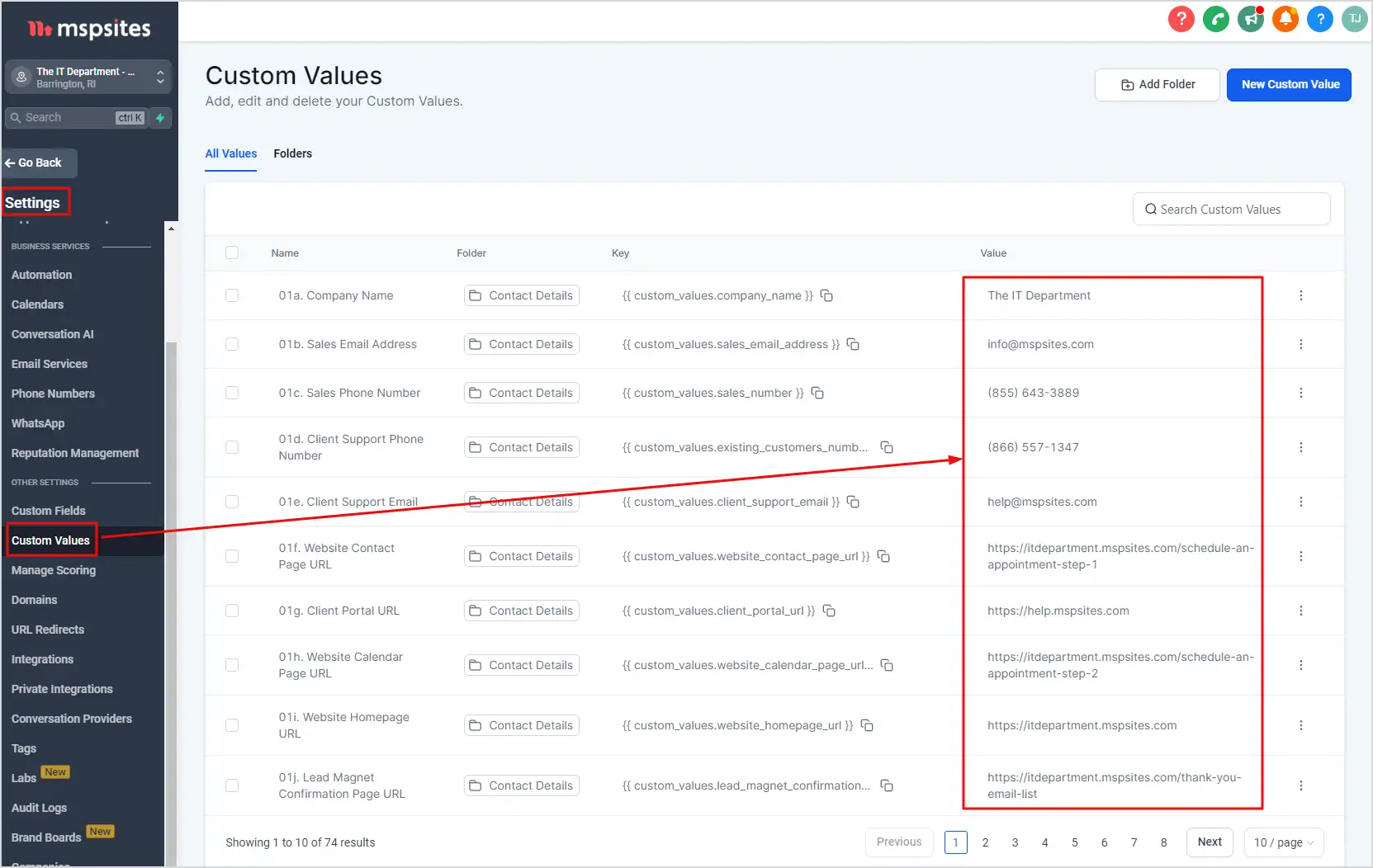 Before using the template, please go to Settings > Custom Values and fill in all the custom values (your company name, address, contact and support phone numbers, your logo and brand colors, testimonials from your clients etc.) as shown in the screenshots.