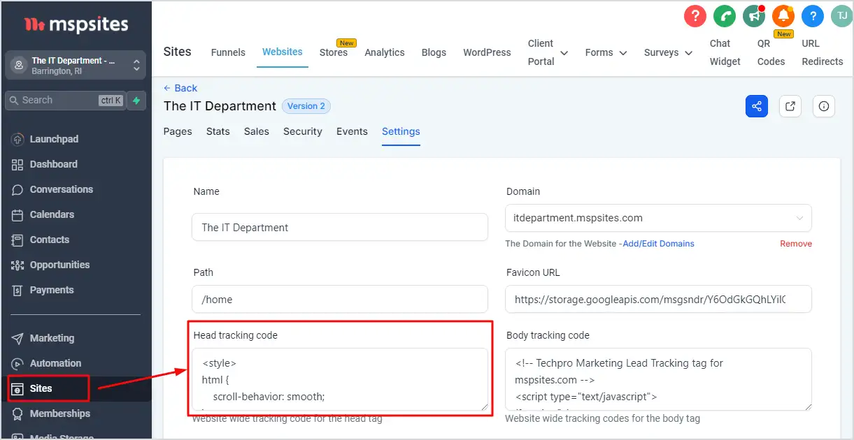 Copy and paste the CSS code in Sites > Websites > Settings > Head Tracking Code, as shown below: